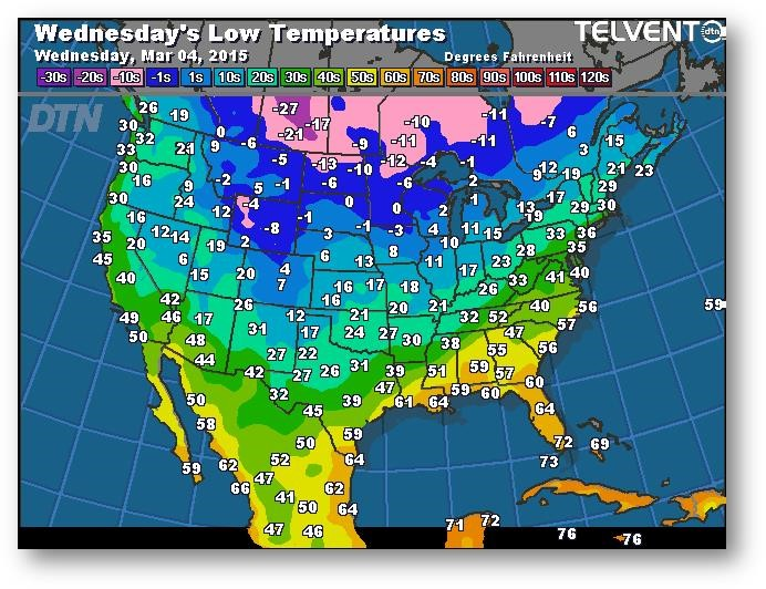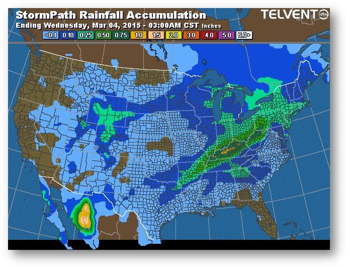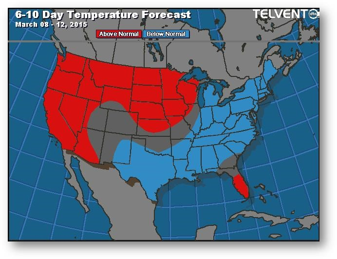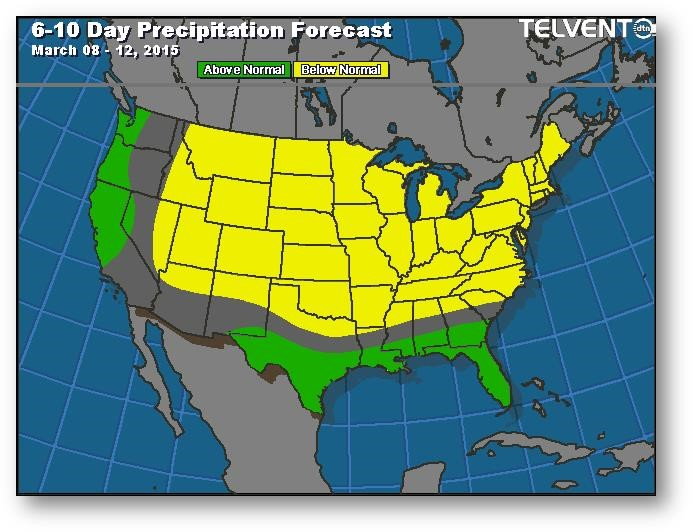 Pour la semaine se terminant le 26 février, les exportations ont été élevées à 50,4 millions de boisseaux, ce qui est supérieur à la prévision de 40 millions de boisseaux/semaine pour le trimestre mars-mai. L'augmentation des livraisons américaines au cours des deux dernières semaines semble compenser le ralentissement saisonnier au Brésil. On y prévoit pour les 10 prochains plus de précipitations que la normale dans les régions de culture de la safrina, ce qui pourrait ralentir davantage le deuxième ensemencement. Il n'y a aucun signe de manque de maïs aujourd'hui, ni aux États-Unis ni ailleurs dans le monde. Actuellement, le marché se base principalement sur la possibilité d'une diminution de superficie et d'un resserrement du bilan aux États-Unis pour 2015-2016.