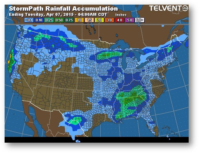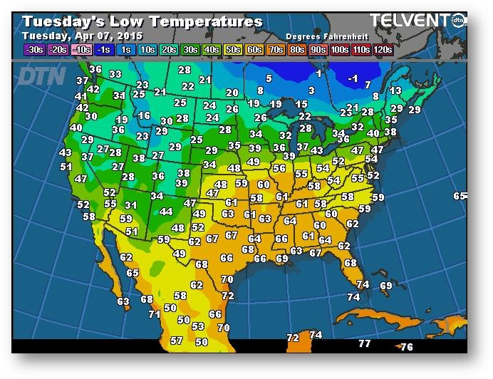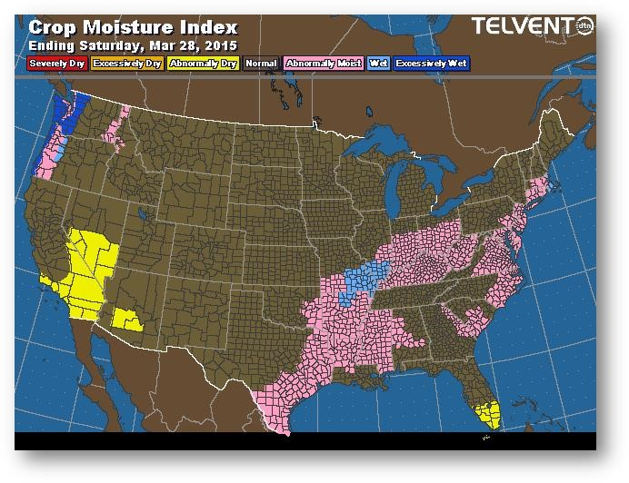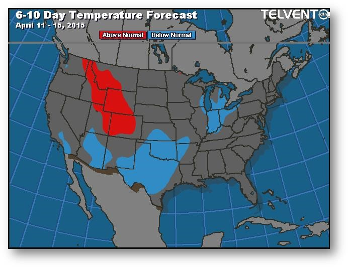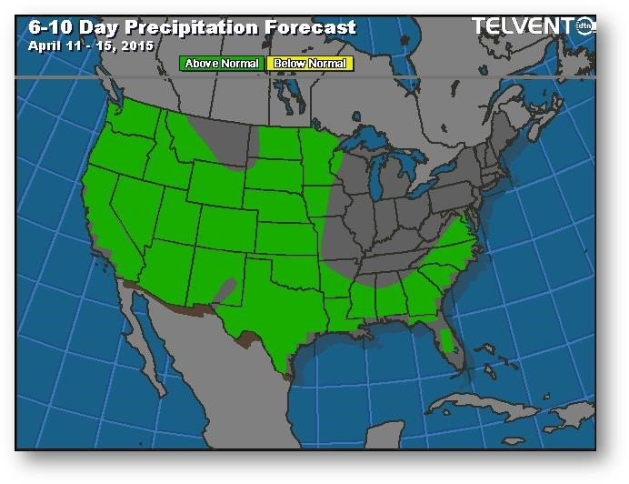 Le marché tente lentement d'instaurer une prime liée aux conditions météo. Les agriculteurs ne sont pas concentrés sur les ventes de leur ancienne ou nouvelle récolte en ce début de travaux dans les champs. Le 10 avril est la date de début de couverture du programme d'assurance récolte pour la majeure partie de la Corn Belt. On ne voit pas de raison qui pourrait pousser les agriculteurs à semer hâtivement vu le risque qui en découle. Jeudi, le USDA mettra à jour ses données sur l'état de l'offre et de la demande; on s'attend à une augmentation des stocks de report de 2014-2015 à 1852-1877 millions de boisseaux.