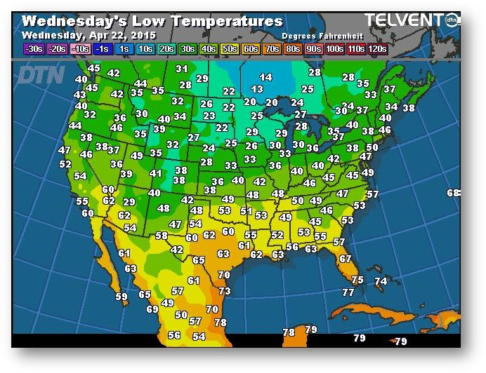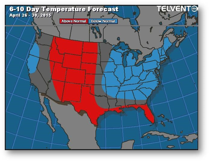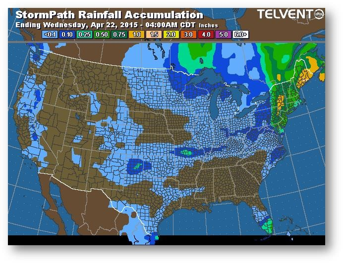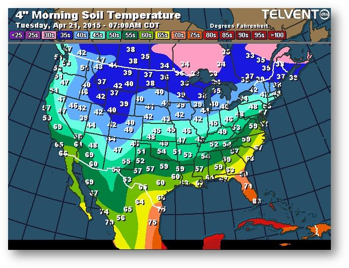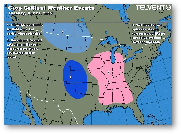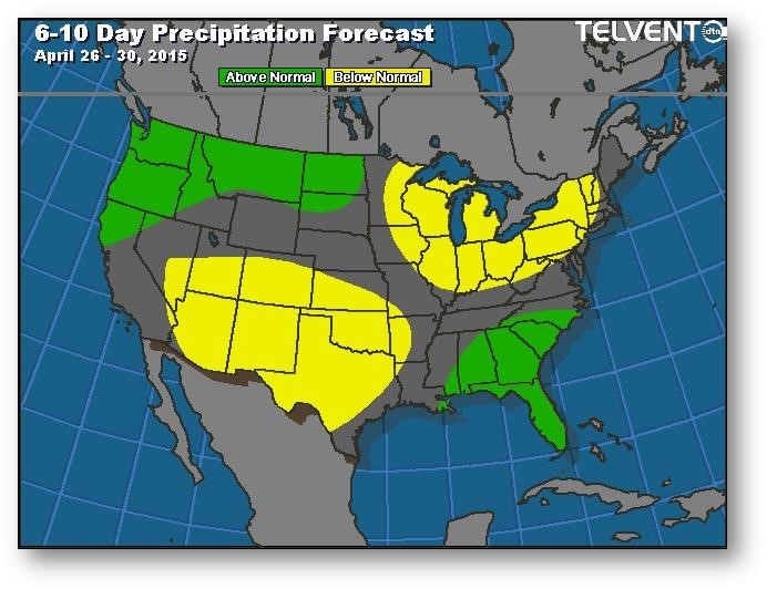 Au cours des derniers jours, les précipitations ont été relativement normales dans la Corn Belt, mais les températures pourraient se mettre à tomber sous la moyenne et ralentir l'ensemencement. L'évaluation de la progression des semis a indiqué une bonne augmentation dans le nord-ouest alors que l'est est légèrement en retard. Les exportations ont été bonnes à 42 millions de boisseaux et supérieures à la moyenne hebdomadaire de 28 millions de boisseaux nécessaire pour atteindre la prévision. L'Argentine a accordé des permis d'exportation pour un autre 3,5 millions de tonnes pour la récolte actuelle, ce qui porte le total à 11,5 millions de tonnes sur la récolte de 24-27 millions de tonnes. Résultats des semis de la semaine dernière pour le delta : Arkansas 66% (moyenne 73%) et Mississippi 71% (moyenne 82%). Pour l'instant, le risque de perdre de la superficie semble concentré en Arkansas, au Mississippi, au Kentucky et au Tenessee. Les intentions d'ensemencement dans ces quatre états en mars étaient d'un total de 3,4 millions d'acres. En raison des prévisions de pluie dans la région cette semaine, il est raisonnable de s'attendre à une perte d'environ 10%.