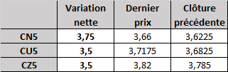 Sur le plan technique, le contrat à terme de juillet (CN5) a la possibilité de grimper, mais pas beaucoup. Il faut s'attendre à une forte résistance aux creux de mars et de janvier (3,75$ - 3,80$). La moyenne mobile à 50 jours coïncide avec le sommet de la fourchette, actuellement à 3,81$. Cependant, avant un nouveau test de ces creux, le marché devra briser sa moyenne mobile à 20 jours; le marché n'y est pas parvenu depuis le 6 avril. La situation est exactement la même pour la prochaine récolte.