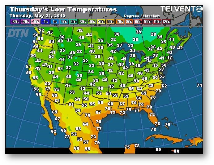 Le marché du maïs continue de glisser. Les températures ont avoisiné le point de congélation dans le Dakota du Nord mardi matin, mais les inquiétudes relatives au gel ont affecté les prix lundi et n'étaient plus un facteur hier. Ce matin, il y avait possibilité de gel dans certains secteurs du nord-ouest de la Corn Belt, mais on ne s'attend pas à des dommages à grande échelle. Les marchés extérieurs ont certainement influencé celui des céréales et le dollar américain continue de s'apprécier alors que les prix du brut tentent de demeurer près de 60$.