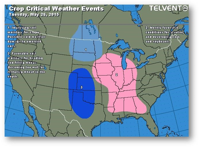La progression de l'ensemencement pour l'ensemble des États-Unis devrait se situer autour de 91-94% après la clôture aujourd'hui; la moyenne est de 89%. La première évaluation des cultures sera également publiée après la clôture et on s'attend à un résultat près de 75% dans la catégorie bon/excellent. Le rapport COT indique toujours une position courte considérable. Certains acteurs du marché parlent de la possibilité de perte de superficie de maïs au Nebraska, au Kansas et au Missouri, où les précipitations incessantes empêchent la fin des semis.