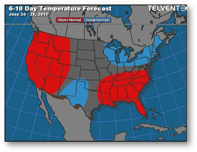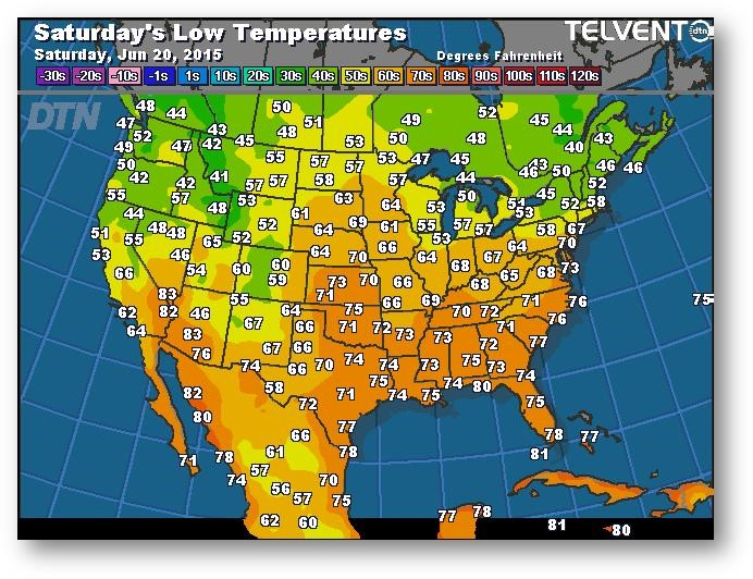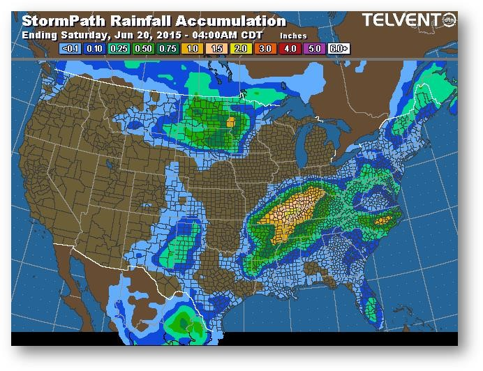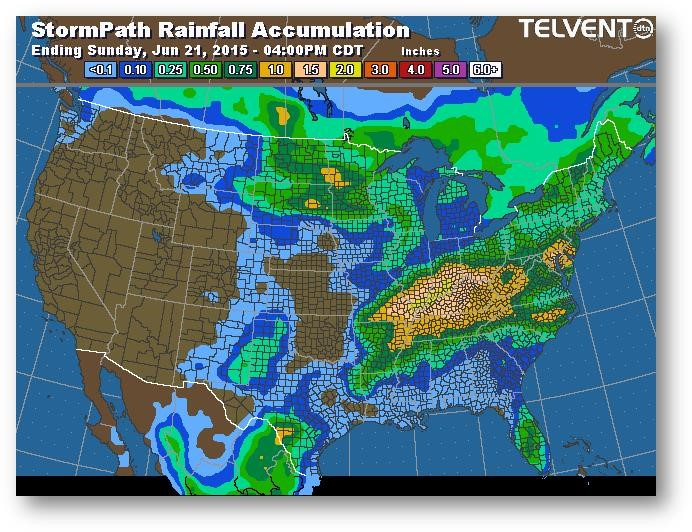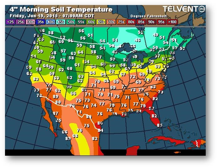 Les préoccupations relatives à la météo à court terme sont compensées par les prévisions de temps plus sec à long terme, l'importance des stocks non vendus par les agriculteurs dans la Corn Belt et le bon départ connu dans les régions qui ne sont pas trop touchées par les précipitations. La tempête tropicale Bill se concentre sur le sud du Missouri, de l'Arkansas et de l'Illinois. Si la tempête continue de se diriger vers le sud, on peut s'attendre à ce que les semis avancent dans le nord du Missouri. Les températures sont normales à sous la normale, ce qui se traduit normalement par un rendement considérable, mais la perte d'azote en raison des fortes précipitations et du temps chaud/sec dans le sud-est pourrait limiter le potentiel moyen dans l'ensemble des États-Unis.