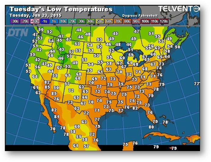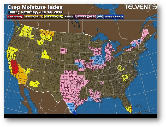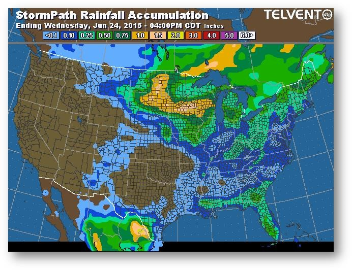 Le rapport mensuel "Cattle On Feed" du USDA a indiqué un résultat de 101% pour le boeuf en parc d'engraissement en date du 1er juin, ce qui correspondait aux attentes. Les placements en mai représentaient 90% du total d'il y a un an et les commercialisations sont à 92%. Le rapport "Hog and Pig" sera publié vendredi prochain. Le marché s'attend à un inventaire de 108% en date du 1er juin. Ce soir, l'évaluation de l'état des cultures devrait indiquer un léger recul en raison d'une baisse des cotes au Missouri, en Illinois et dans l'est de la Corn Belt à la suite des pluies excessives; l'amélioration des cotes dans l'ouest de la Corn Belt ne vient que compenser une partie du recul. On prévoit encore des précipitations cette semaine. Il faudra surveiller les prévisions pour la semaine prochaine et jusqu'à la mi-juillet.