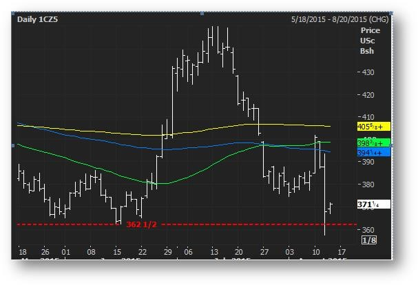 Hier, le USDA a publié des données surprenantes qui ont brièvement abaissé le prix du maïs à sa limite de 0,30$. Quelques minutes après la publication du rapport du USDA, les prix ont touché de nouveaux creux de contrat intrajournaliers. Il est difficile de dire si les pertes sont terminées avec un rendement de 168,8 boisseaux/acre, aucune modification dans la superficie et des rendements records dans 10 États (notamment quelques-uns dans l'est de la Corn Belt). Ceci étant dit, le marché est normalement en baisse de la mi à la fin août puisque le marché s'attend à des conditions météo favorables.