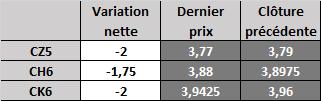 Hier, les prix sont sortis de la fourchette et ont clôturé à la baisse. Puisque la clôture s'est faite sous 3,80$, le prochain niveau de support se situe à 3,75$ pour le contrat de décembre.