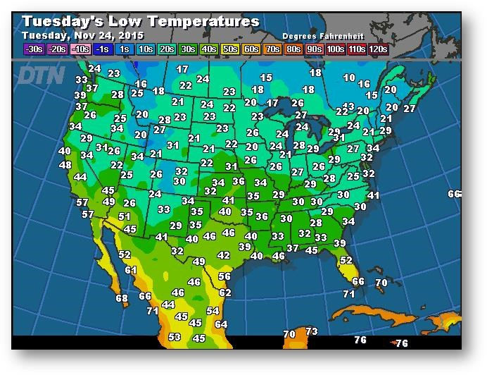 Prévisions des températures les plus basses (degrés Farenheit)