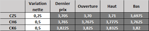 Au cours de la nuit, les prix n'ont presque pas bougé après avoir considérablement grimpé dans la journée. En matinée, les ventes à l'exportation annoncées étaient faibles, mais ça n'a pas suffi à ralentir la hausse. Informa a revu ses prévisions de production pour l'Amérique du Sud; l'évaluation de la production de maïs en Argentine est passée de 18,5 à 21 millions de tonnes, celle du Brésil de 81,8 à 81,3 millions de tonnes. Il faudra voir aujourd'hui si le mouvement d'hier se poursuivra. Les facteurs fondamentaux ne changent pas. Un solide niveau de résistance se situe toujours à la moyenne mobile à 50 jours à 3,845$ (CH6).