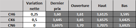 Clôture pratiquement neutre hier et séance de nuit tranquille. Une certaine couverture de positions a déclenché des gains tôt en journée hier, mais la faiblesse des ventes à l'exportation et des marchés extérieurs a fait redescendre les prix. Les marchés au comptant ne bougent pas beaucoup. Aucune nouvelle fraîche. Les stocks sont toujours amplement suffisants aux États-Unis et les exportations n'ont toujours pas pris leur envol. Les indicateurs techniques pointent vers des conditions de survente. Le rapport COT qui sera publié aujourd'hui donnera une meilleure idée de la composition du marché et pourrait donner le ton pour la semaine prochaine. Les prix restent fixés à l'intérieur de la fourchette entre 3,50$ et 3,70$.