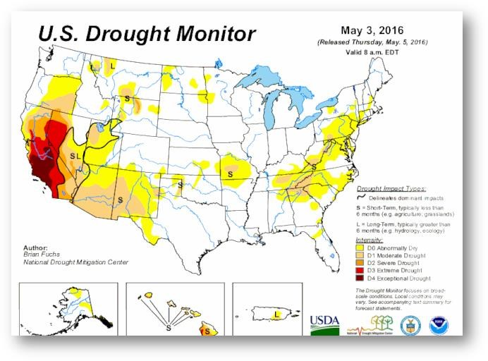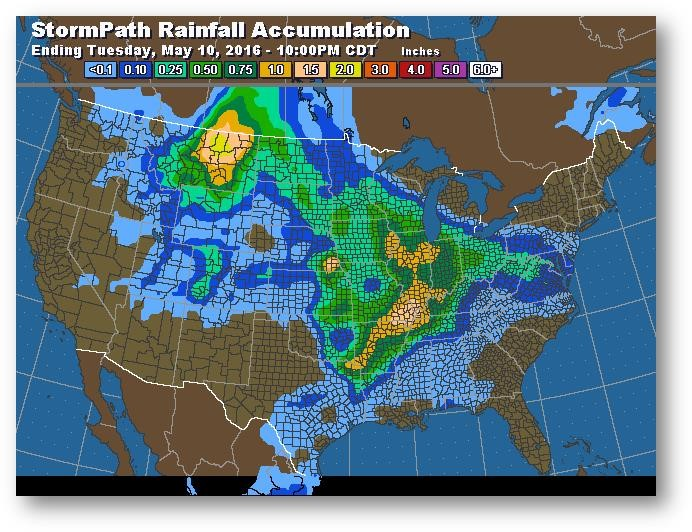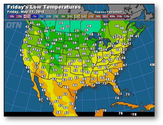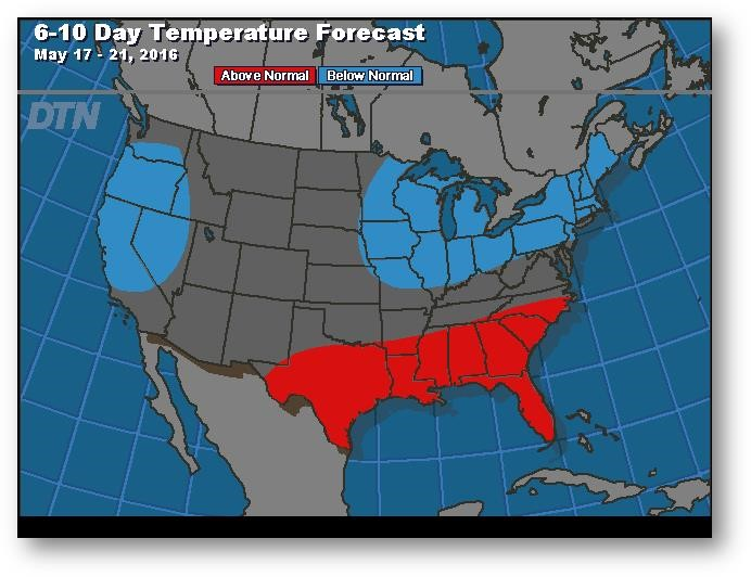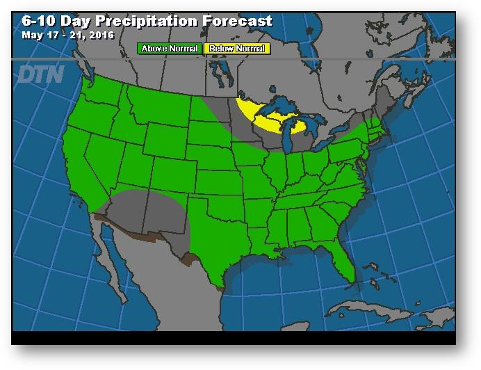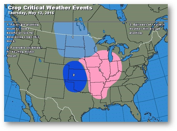 À la suite de la publication du rapport, les prix ont chuté hier puis remonté au cours de la nuit. La Corn Belt devrait recevoir des précipitations toute la semaine, mais il semble que le temps devrait être plus sec la semaine prochaine. Les régions produisant la safrinha au Brésil pourraient recevoir quelques précipitations à la fin de la semaine prochaine. La production d'éthanol pour la semaine qui s'est terminée le 6 mai était de 962 000 barils/jour alors qu'elle avait été de 923 000 la semaine précédente. La production devrait augmenter maintenant que les mises hors service saisonnières des usines achèvent. Les stocks ont diminué malgré l'augmentation de production. Comme le mélange essence/éthanol était plus bas, il semble que les activités d'exportation aient été élevées. Les ventes à l'exportation de maïs devraient tourner autour de 900 000 - 1 200 000 tonnes pour la dernière récolte et de 175 000 - 325 000 tonnes pour la prochaine récolte. On s'attend à ce que les prix fluctuent en raison des stocks de report de 2153 millions de boisseaux et de l'incertitude des conditions météo estivales et du rendement.