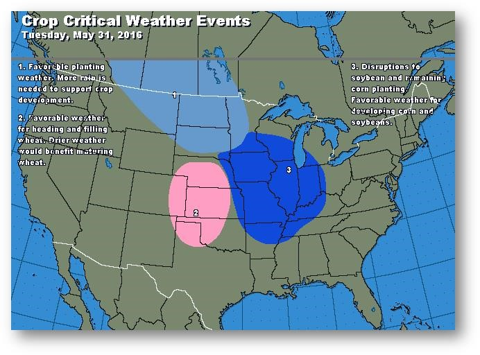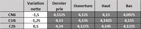 Au cours de la nuit, les prix se sont affaiblis à la suite d'une fin de semaine de trois jours aux États-Unis et d'une bonne semaine la semaine dernière avec le contrat de juillet (CN6) qui a clôturé en hausse de 0,18$ et le contrat de décembre (CZ6) en hausse de 0,14$. La force récente s'explique principalement par l'amélioration des perspectives d'exportation américaines puisque la safrinha au Brésil continue de se détériorer dans les conditions persistantes de sécheresse. Le temps chaud et sec en fin de semaine aux États-Unis a permis de bien faire avancer les semis. Le rapport COT de vendredi indique que les fonds gérés ont ajouté près de 20 000 contrats à leur position longue nette, portant le total à 74 456 en date du 24 mai. D'autres contrats ont vraisemblablement été ajoutés à la fin de la semaine dernière. Le maïs demeure en territoire d'extrême survente technique. Comme les prévisions sont favorables pour les 10 à 14 prochains jours dans la Corn Belt, on pourrait voir une correction à la baisse.