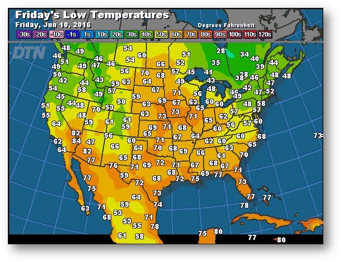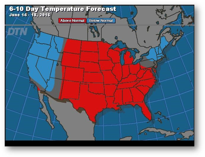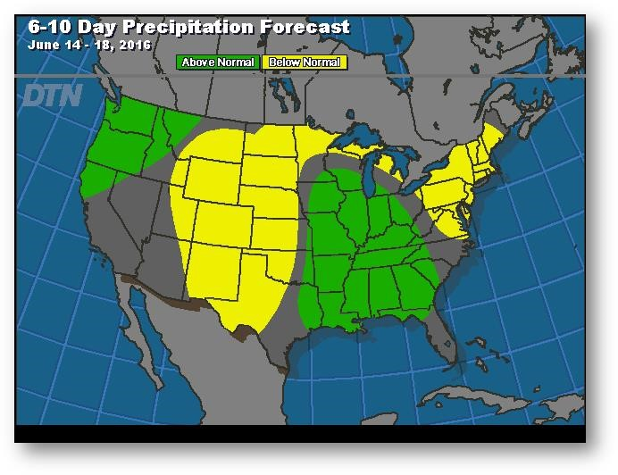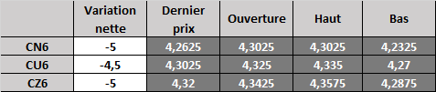 Les prix ont grandement reculé au cours de la nuit puisque les modèles météo pour les 6-10 prochains jours indiquent des précipitations dans la Corn Belt. Les conditions de surachat technique ont également ajouté de la pression. Les contrats à terme ont maintenant complètement effacé les gains d'hier; le contrat de juillet (CN6) se trouve à plus de 0,15$ des sommets. La hausse d'hier était principalement due aux prévisions de temps chaud pour la Corn Belt d'ici la fin de semaine, mais des précipitations sont désormais attendues en début de semaine prochaine, ce qui allège les inquiétudes relatives à des conditions stressantes pour les cultures en début de croissance. La production d'éthanol pour la semaine s'étant terminée le 3 juin a été élevée à 1 006 000 barils/jour, +46 000 barils/jour par rapport à la semaine précédente et +1,4% par rapport à l'an passé. Les stocks ont diminué, ce qui est normal en cette période de l'année puisque la demande augmente. Aujourd'hui, les ventes à l'exportation devraient tourner autour de 900 000 - 1 200 000 tonnes pour la dernière récolte et de 100 000 - 300 000 tonnes pour la prochaine récolte. Le marché réagit fortement aux changements de prévisions météo; à surveiller.