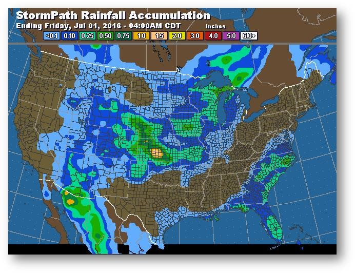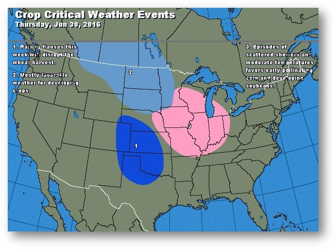 Hier, les prix ont chuté; le contrat de septembre (CU6) a clôturé en baisse de 0,10$. Les prévisions de précipitations à court terme ont déclenché une liquidation agressive de la position longue et la clôture de positions en vue de la publication des rapports d'aujourd'hui. L'affaissement du marché du blé a également été un élément baissier. Évidemment, l'attention aujourd'hui sera tournée vers les rapports du USDA sur les stocks et les superficies, mais il y a d'autres rapports à surveiller. Hier, le rapport sur l'éthanol a indiqué une augmentation de 4,3% de la production à 1,003 million de barils par jour en date du 24 juin. Le mélange essence/éthanol a atteint un nouveau record et les stocks d'éthanol sont aussi en hausse. Les ventes à l'exportation seront annoncées ce matin; le marché s'attend à 700 000 - 1 000 000 tonnes pour la dernière récolte et à 300 000 - 450 000 tonnes pour la prochaine récolte. C'est fin de mois, fin de trimestre et jour de publication de rapport, ce qui devrait bien alimenter le marché aujourd'hui.