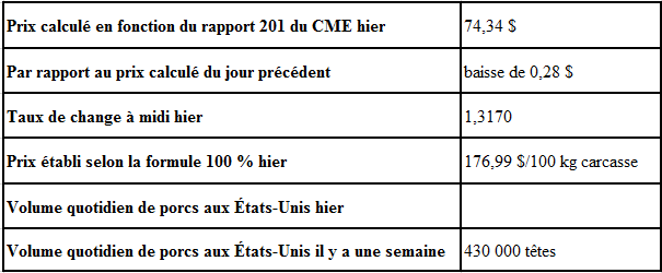 Les contrats à terme ont clôturé en baisse de quelques sous hier et l'affaiblissement s'est poursuivi au cours de la nuit; le contrat de décembre (CZ6) teste le niveau de support du creux de contrat à 3,3325$. Les prévisions météo 8-14 jours demeurent favorables avec des températures normales. Le Conseil international des céréales a revu à la hausse son évaluation de production mondiale de maïs pour 2016-2017 de 1,003 à 1,017 milliard de tonnes. Hier, les ventes à l'exportation ont été de 438 800 tonnes pour la dernière récolte et de 476 500 tonnes pour la prochaine récolte. Les ventes de la dernière récolte correspondent maintenant à 100,9% des prévisions du USDA comparativement à une moyenne de 100,5% pour cinq ans. Aujourd'hui, il faudra surveiller la clôture : une clôture sous le creux de contrat serait un indice pour une autre cassure vers un test du creux de 2014 à 3,1825$.