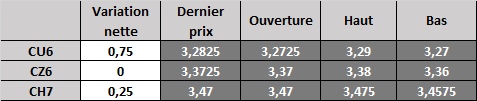 Rien ne pousse le marché dans une direction ou dans l'autre aujourd'hui. Le sommet du contrat à terme de septembre (CU6) à 3,29$ a résisté pour trois séances consécutives, il faudra voir s'il sera traversé aujourd'hui. L'augmentation des prix offerts par les utilisateurs finaux a supporté un peu le marché et les producteurs exercent une pression minimale. Les prévisions météo ne sont pas menaçantes avec un refroidissement des températures et du temps plus humide. La production d'éthanol sera publiée ce matin et on s'attend à un ralentissement saisonnier. Les tournées privées de cultures dans le Midwest permettront d'avoir d'autres données à comparer à l'évaluation de rendement du USDA à 175,1 boisseaux/acre. Les prix devraient rester neutres, mais les macro marchés pourraient fournir un certain enthousiasme de même que l'augmentation de la volatilité du dollar américain cette semaine.