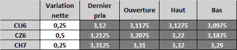 Hier, les prix ont touché de nouveaux creux de contrat à 3,1075$ (contrat de septembre CU6) et ont clôturé en baisse de 0,045$. Il n'y a pas vraiment eu de nouvelles fraiches, mais les prévisions météo non menaçantes et la faiblesse dans le blé sont principalement à l'origine de la baisse des prix. Les inspections à l'exportation ont été de 1 422 000 tonnes, ce qui est inférieur à la moyenne hebdomadaire nécessaire pour atteindre la prévision du USDA. Actuellement, les inspections correspondent à 93,2% de la prévision du USDA alors que la moyenne des cinq dernières années est de 95,7%. L'état des cultures est toujours évalué à 75% dans la catégorie bon/excellent, bien au-delà de la moyenne de 10 ans à 59%. Il est toujours possible de voir un test de 3$, mais on s'attend à un grand support à ce prix. Aucun facteur fondamental n'est susceptible de déclencher un redressement aujourd'hui, mais peut-être un bond de correction basé sur les conditions de survente.