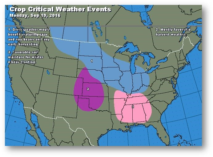 Les prix se sont légèrement raffermis en ce début de semaine en raison de la couverture de positions courtes à la suite de vendredi. Le contrat à terme de décembre (CZ6) se situe actuellement sur la moyenne mobile à 50 jours et teste les 3,40$. Le marché est encore en condition de forte survente. Vendredi, le rapport COT a confirmé une bonne couverture de positions courtes avant la publication du rapport du USDA le 12 septembre, mais les fonds gérés détenaient toujours une position courte de 152 000 contrats en date du 13 septembre. Les premiers rapports de rendement ont été bons, mais ne correspondent pas à 175 boisseaux/acre. Et, bien qu'il soit trop tôt pour se faire une idée précise du rendement aux États-Unis, ces rapports aident à fournir du support, surtout en raison de la position courte des fonds. Les précipitations de la fin de semaine ont retardé brièvement la récolte, mais ne devraient pas poser de problème au cours des cinq prochains jours. Le contrat de décembre (CZ6) semble se diriger vers un test du sommet de la fourchette récente autour de 3,45-3,50$, à surveiller.