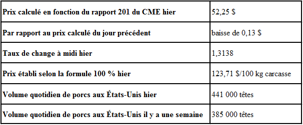 Évolution du prix des porcs castrés et des jeunes truies selon le National Daily Direct Afternoon Hog Report d’hier : hausse prévue de 0,04$ par rapport à la clôture précédente