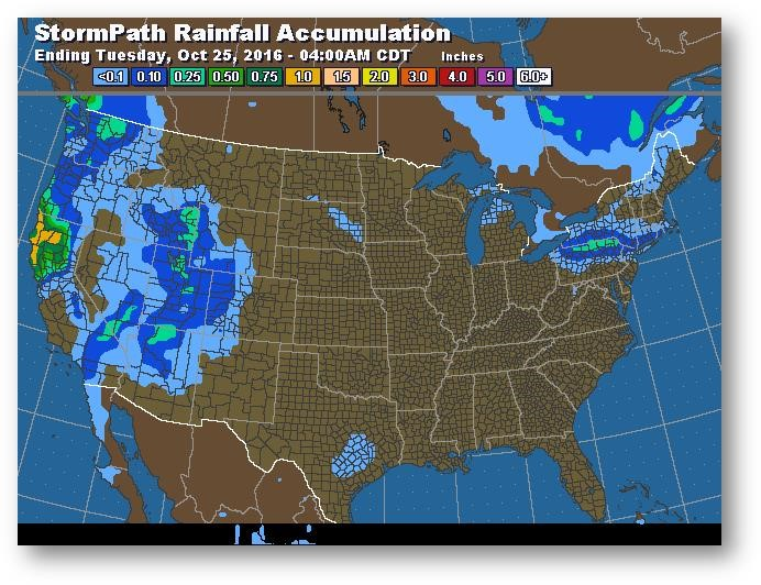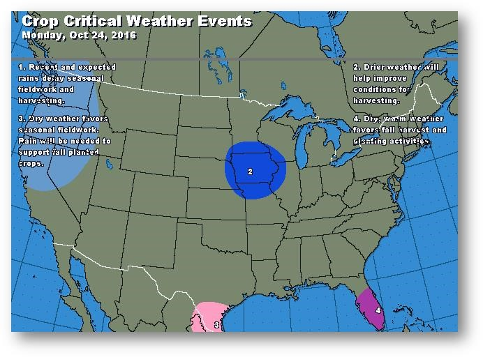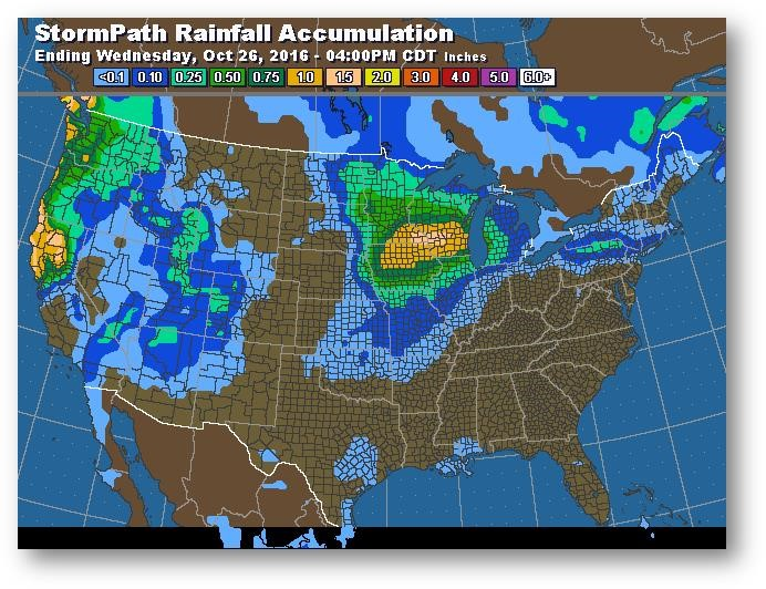 Au cours de la nuit, le niveau de support à 3,50$ du contrat à terme de décembre (CZ6) a tenu bon et les prix demeurent au neutre. Aujourd'hui, on devrait annoncer que la récolte est complétée à au moins 60% comparativement à une moyenne de 57% pour les dix dernières années. Les conditions météo demeurent favorables dans la majeure partie de la Corn Belt, mais on s'attend à de bonnes précipitations dans le nord de l'Iowa et le sud du Minnesota au cours des cinq prochains jours qui pourraient retarder la récolte. Vendredi, le rapport COT a indiqué une importante couverture de la part des fonds. Les fonds gérés détenaient une position courte nette de 52 000 contrats en date du 18 octobre alors qu'elle était de 122 000 la semaine précédente, ce qui renforce l'idée que la couverture de positions courtes s'est essouflée autour de 3,60$. Il faudra des nouvelles haussières ou une influence des marchés extérieurs pour voir les prix traverser les sommets récents.