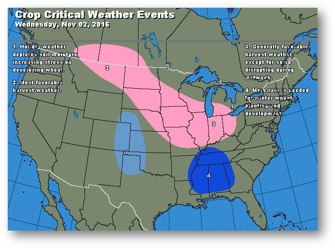 La séance de nuit a été tranquille à la suite d'une journée à la baisse hier; le contrat de décembre (CZ6) a clôturé en baisse de 0,0575$ et sous la moyenne mobile à 100 jours et le support à 3,50$. La fin de la récolte semble ajouter de la pression de même que le prix du soja/tourteau. Les conditions météo demeurent favorables pour les prochains jours. FC Stone a publié la mise à jour de ses prévisions après la clôture hier; rendement de maïs évalué à 175,3 boisseaux/acre (USDA : 173,4). Informa publiera ses données demain. Les prix demeurent à l'intérieur de la fourchette. La prochaine cible à la baisse est à 3,40$, qui est la moyenne mobile à 50 jours.