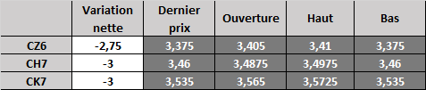 Les prix sont affaiblis en début de semaine à la suite de la clôture en baisse vendredi. Les données négatives publiées par le USDA en ce qui a trait à l'état de l'offre et de la demande la semaine dernière pèsent toujours sur le marché, notamment les stocks de report de plus de 2,4 milliards de boisseaux. La récolte est presque terminée et l'attention se tournera maintenant vers les conditions météo en Amérique du Sud et la saison de croissance. Jusqu'à maintenant, il n'y a aucun problème majeur à signaler. L'ensemencement au Brésil est en avance et la progression en Argentine est également intéressante. La publication du rapport COT est reportée à ce soir, après la clôture, en raison du jour du Souvenir vendredi dernier. On s'attend à ce que les prix demeurent neutres à baissiers. Le creux de la fourchette autour de 3,20-3,30$ devrait constituer un niveau de support solide et le sommet de la fourchette se trouve à 3,60$.