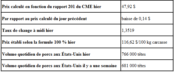 Évolution du prix calculé en fonction du rapport 201 du CME : baisse prévue de 13,55 $/100lb
