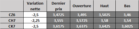 Les prix ont reculé cette nuit à la suite de la hausse d'hier. Le contrat de décembre (CZ6) a grimpé d'un peu plus de 0,05$ hier, supporté par les signaux techniques positifs et les achats de commodités par les fonds. La résistance a tenu bon à 3,50$. Les agriculteurs ont procédé à des ventes hier, mais une augmentation de 0,20-0,30$ sera vraisemblablement nécessaire pour qu'ils se montrent plus enclins à se départir de leur maïs. Les inspections à l'exportation ont révélé un résultat de 876 milliers de tonnes et la moyenne hebdomadaire nécessaire pour atteindre la prévision du USDA est maintenant de 1,088 million de tonnes. La récolte est pour ainsi dire terminée; elle est complétée à 97%. Le Michigan a encore le plus à faire avec une récolte complétée à seulement 83%. Le redressement des prix hier n'a pas tellement changé les perspectives à long terme. La fourchette actuelle se maintient avec un sommet à 3,60$.
