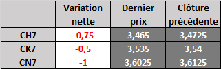 à l'intérieur d'une fourchette étroite. Le contrat de mars (CH7) s'est déplacé à l'intérieur d'une fourchette de 0,015$ alors que la fourchette avait été de 0,02$ jeudi pour les séances de jour et de nuit combinées. Tôt vendredi matin, le volume était seulement de 5200 contrats. Le marché en général est en baisse en raison d'un manque de nouvelles pour offrir du support. Toutefois, les ventes à l'exportation et les livraisons demeurent élevées et sont bien en avance sur la moyenne. Il y a indication que les négociants commerciaux restent intéressés dans le marché, mais l'activité quotidienne rend la situation difficile à évaluer. La séance de vendredi clôture tôt pour la période des Fêtes.