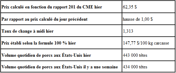 Évolution du prix des porcs castrés et des jeunes truies selon le National Daily Direct Afternoon Hog Report d’hier : hausse prévue de 0,91$ par rapport à la clôture précédente