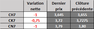 Le contrat à terme de mars (CH7) a été pratiquement neutre cette nuit; il est resté dans une étroite fourchette et près des sommets de mardi. Les inquiétudes relatives aux fortes précipitations dans le centre nord de l'Argentine supportent toujours les prix. Cette semaine, on prévoit aussi de fortes précipitations dans les régions de culture au nord du Brésil, alors que de légères pluies sont attendues dans le sud du Brésil et en Argentine. La publication des rapports du département de l'Énergie est reportée à ce jeudi; ainsi la séance de mercredi devrait être tranquille. Le contrat de mars se trouve juste sous le niveau de résistance à 3,69$, mais il semble prêt à grimper puisque les prix du maïs américain sont inférieurs à ceux du Brésil, ce qui attire la demande d'exportation.