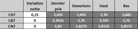 La séance de nuit a été tranquille, mais le contrat de mars (CH7) se trouve pile au point tournant à 3,70$. Il s'agit d'un solide niveau de résistance avec la moyenne mobile à 200 jours à 3,6975$, les indicateurs techniques de surachat et le volume important offert par les producteurs à 3,70$. Toutefois, la dynamique pointe vers la poursuite de la hausse et les fonds n'ont jusqu'à maintenant pas ralenti leur couverture de positions courtes. Vendredi, il était indiqué dans le rapport COT que les fonds gérés détenaient une position nette courte de 54 000 contrats en date du 17 janvier comparativement à 77 000 la semaine précédente. Aujourd'hui, leur position est vraisemblablement plus près de 40 000 contrats vu l'activité qui a eu lieu à la fin de la dernière semaine. Il y a encore de la place pour que la couverture se poursuive et pousse les prix vers le haut. Une clôture au-dessus de 3,70$ déclencherait une cassure technique. Toutefois, les perspectives à long terme sont toujours négatives en raison des stocks de report de 2,355 milliards de boisseaux et la possibilité d'augmentation de la superficie d'ensemencement de maïs pour 2017.