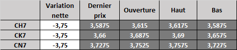 Au cours de la nuit, les prix se sont affaiblis; le marché a réagi à la publication du rapport COT publié vendredi soir. Le secteur des fonds gérés a acheté plus agressivement que ce qui était prévu la semaine dernière. Pour la semaine ayant pris fin le 24 janvier, ils ont acheté 70 000 contrats (net), ce qui a porté leur position de -51 000 (courte) à 21 000 (longue). Il s'agit de la première position nette longue pour les fonds gérés depuis le 5 juillet. Les achats ont été absorbés par les ventes des producteurs à des prix autour de 3,60-3,70$. Les conditions météo en Amérique du Sud ne semblent toujours pas menaçantes, ce qui ajoute à la pression. Sans nouvelle haussière, on s'attend à ce que le contrat à terme de mars (CH7) teste les moyennes mobiles à 50 et à 100 jours à 3,57$ et 3,55$ puis se maintienne de nouveau à l'intérieur de sa fourchette.