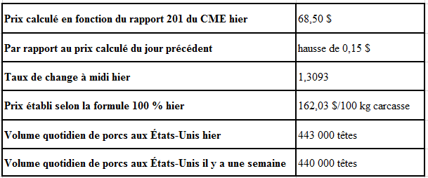 Évolution du prix des porcs castrés et des jeunes truies selon le National Daily Direct Afternoon Hog Report d’hier : baisse prévue de 0,25$ par rapport à la clôture précédente