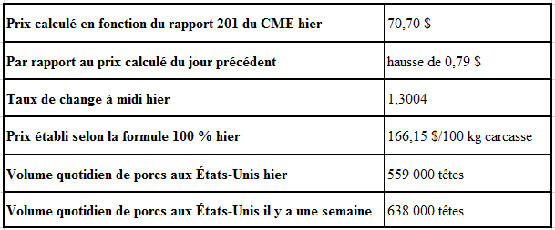 Évolution du prix des porcs castrés et des jeunes truies selon le National Daily Direct Afternoon Hog Report d’hier : baisse prévue de 0,45$ par rapport à la clôture précédente