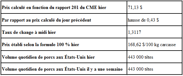 Évolution du prix des porcs castrés et des jeunes truies selon le National Daily Direct Afternoon Hog Report d’hier : hausse prévue de 0,70$ par rapport à la clôture précédente