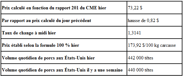 Évolution du prix des porcs castrés et des jeunes truies selon le National Daily Direct Afternoon Hog Report d’hier : hausse prévue de 0,92$ par rapport à la clôture précédente