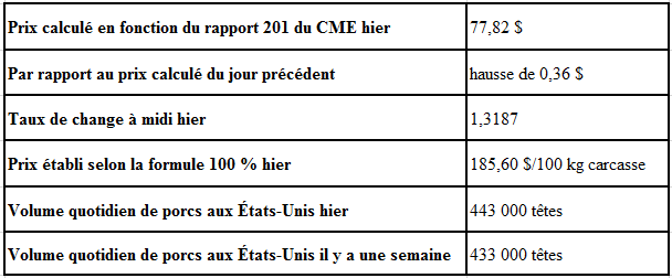 Évolution du prix des porcs castrés et des jeunes truies selon le National Daily Direct Afternoon Hog Report d’hier : baisse prévue de 0,32$ par rapport à la clôture précédente