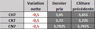Ouverture à la baisse pour la séance de nuit. Le maïs de la dernière récolte a réussi à faire de légers gains tôt vendredi matin. Toutefois, rien de dramatique. Le contrat de mai est demeuré à l'intérieur d'une fourchette de 0,0175$ avec un volume de seulement 9500 contrats. Les légers achats au cours de la nuit pourraient ne pas se poursuivre aujourd'hui; le contrat de mai se trouve toujours dans une tendance baissière à court terme sur son graphique quotidien. La prochaine cible se trouve toujours à 3,6825$; il n'est pas impensable qu'on s'y rende si les ventes à l'approche de la fin de semaine de récolte s'accélèrent.