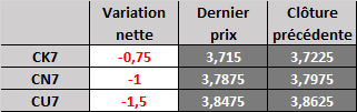 Les prix ont légèrement reculé au cours de la nuit et jusqu'à tôt jeudi matin. Les contrats de la dernière et de la prochaine récolte continuent de s'affaiblir à l'approche de la publication des rapports de mars du USDA. Le niveau de support technique initial à court terme pour le contrat à terme de mars se situe tout près, à 3,6825$, puis ensuite à 3,62$. Le marché reste susceptible de voir une liquidation de la position longue non commerciale, particulièrement si les données du USDA restent sensiblement les mêmes. À l'opposé, il serait possible que l'intérêt acheteur reprenne si le USDA devait dévoiler une importante diminution dans les stocks de report, qui serait le résultat d'une augmentation supérieure aux prévisions en ce qui a trait à la demande totale. Les écarts entre les contrats à terme sont neutres. Le niveau de support technique à court terme pour décembre se situe à 3,8975$ puis à 3,85$. Le total de livraison pour le contrat de mars est maintenant de 519 contrats.