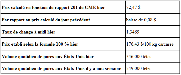 Évolution du prix calculé en fonction du rapport 201 du CME : baisse prévue de 22,46$/100lb