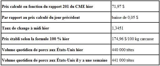 Évolution du prix des porcs castrés et des jeunes truies selon le National Daily Direct Afternoon Hog Report d’hier : hausse prévue de 0,19$ par rapport à la clôture précédente