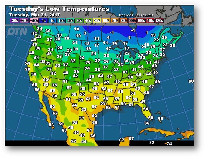 Prévisions des températures les plus basses (degrés Farenheit)