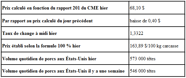 Évolution du prix des porcs castrés et des jeunes truies selon le National Daily Direct Afternoon Hog Report d’hier : baisse prévue de 0,45$ par rapport à la clôture précédente