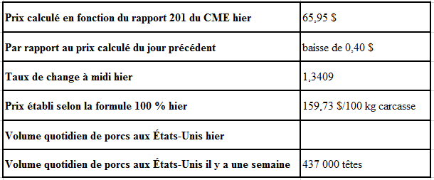 Évolution du prix des porcs castrés et des jeunes truies selon le National Daily Direct Afternoon Hog Report d’hier : baisse prévue de 0,80$ par rapport à la clôture précédente