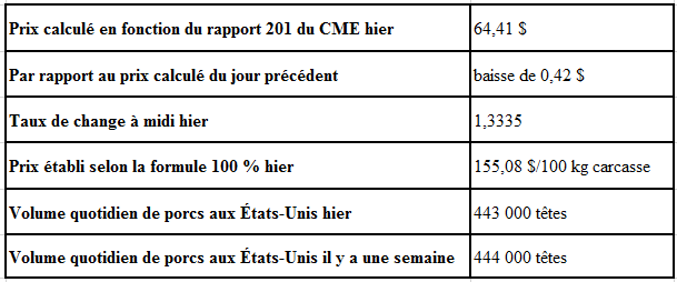 Évolution du prix des porcs castrés et des jeunes truies selon le National Daily Direct Afternoon Hog Report d’hier : baisse prévue de 0,30$ par rapport à la clôture précédente