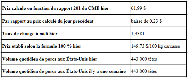 Évolution du prix des porcs castrés et des jeunes truies selon le National Daily Direct Afternoon Hog Report d’hier : baisse prévue de 0,44$ par rapport à la clôture précédente