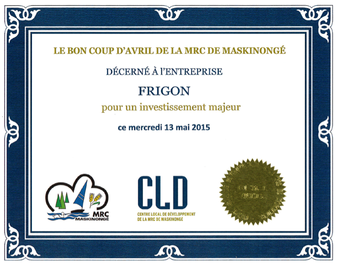 C’est lors d’une assemblée générale que le Préfet Robert Lalonde a remis le bon coup d’avril de la MRC de Maskinongé à l’entreprise Frigon pour son investissement majeur. L'installation d'un système de fabrication en continu de produits de fertilisation a permis à l'entreprise Frigon d'optimiser le volume et la qualité de sa production.
