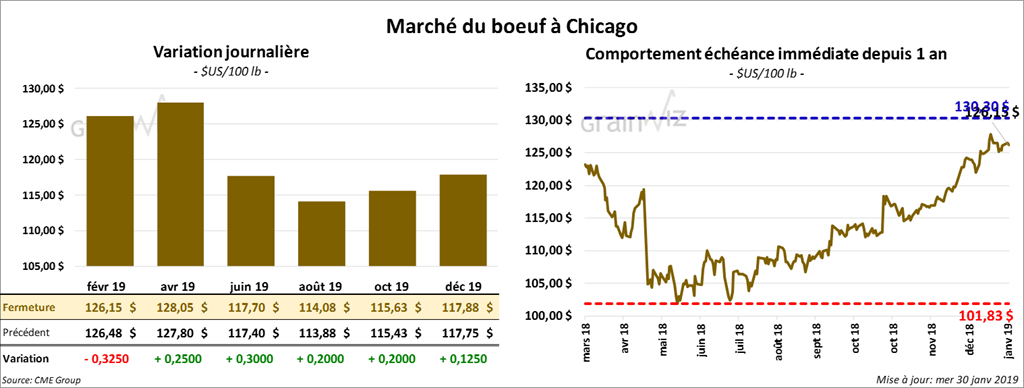 Les contrats de bœuf à Chicago ont connu une progression partagée. Le contrat février 19 a terminé en baisse de 32,5 cents. Les contrats de veau ont fini la session au neutre à haussier de 20 cents. Le contrat janvier 19, qui expirera demain, a, quant à lui, reculé de 27,5 cents.
