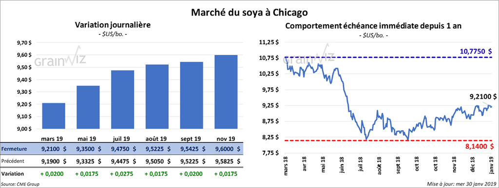 La majorité des contrats de soya à Chicago ont clôturé dans le vert de 2 à 2 ¼ cents. Les contrats de tourteau ont fait l’inverse en reculant de 70 cents/tonne. L’huile a gagné 31 points.
