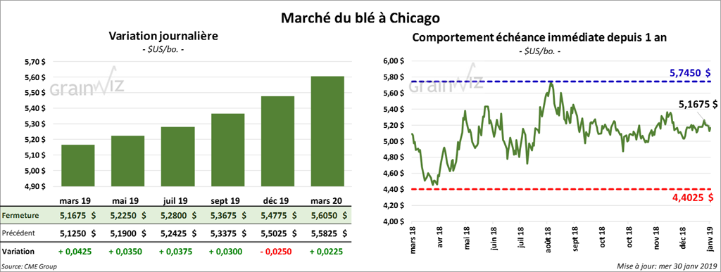 Les contrats de blé US ont fini la session en hausse de 2 à 4 cents. Le dollar américain a baissé après que la Fed ait annoncé aujourd’hui qu’elle laissait ses taux inchangés, au moins pour ce mois-ci. En outre, elle a spécifié qu’elle usera plutôt de patience pour les augmentations à venir.
